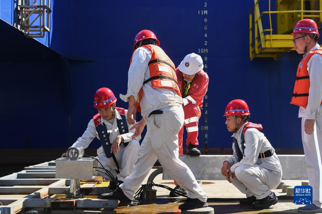 在“一航津安1”號沉管運輸安裝一體船掛載的E19沉管上,鎖旭宏(左一)跟潛水員叮囑拆解水下雙目攝影定位設備要注意的情況(2022年7月22日攝)。 )