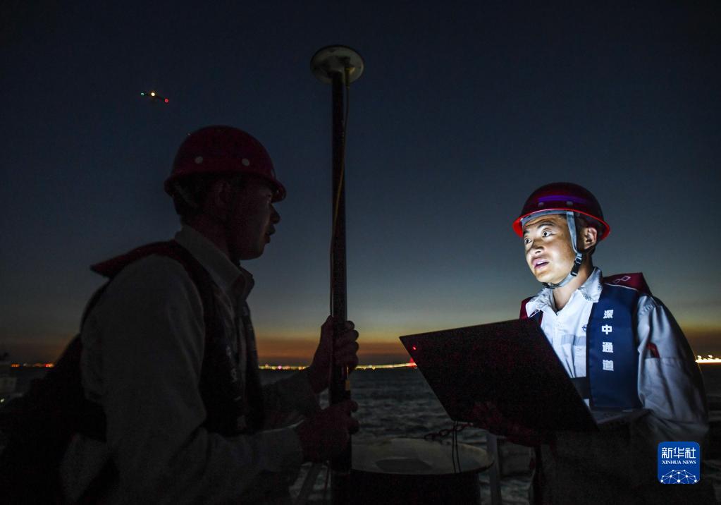 鎖旭宏(右)和隊友在“一航津安1”號沉管運輸安裝一體船搭載的E19沉管上檢查北斗衛星定位精準測量(2022年7月22日攝)。