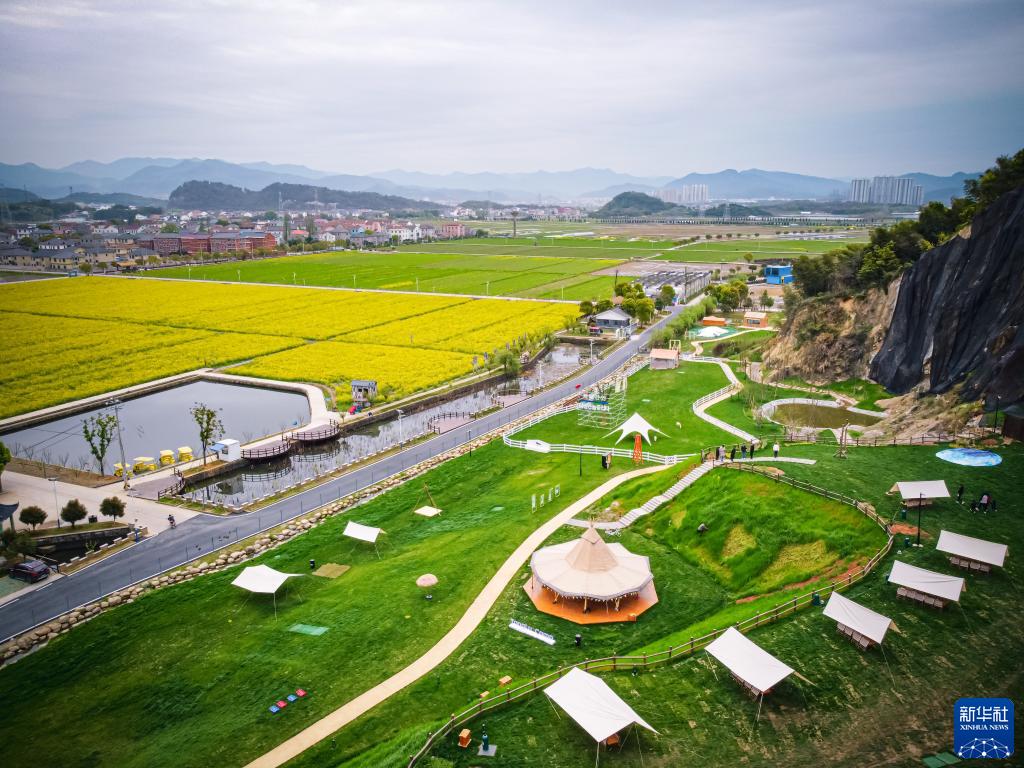 這是3月29日拍攝的浙江諸暨市楓橋鎮杜黃新村用廢棄礦山改造的露營(yíng)旅游地(無(wú)人機照片)。