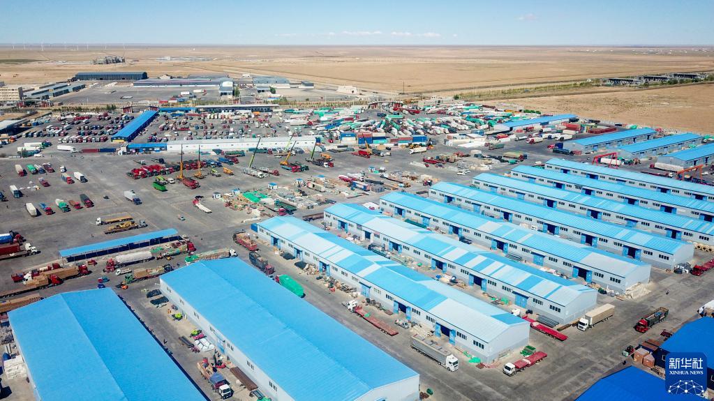 這是6月11日拍攝的二連浩特口岸旁的進(jìn)出口物流園區中的景觀(guān)(無(wú)人機照片)。