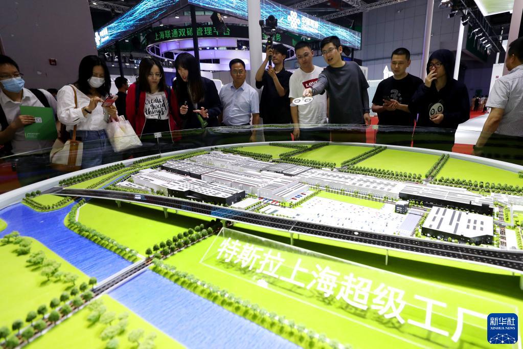 6月11日,參觀(guān)者在特斯拉上海超級工廠(chǎng)沙盤(pán)模型前交流討論。