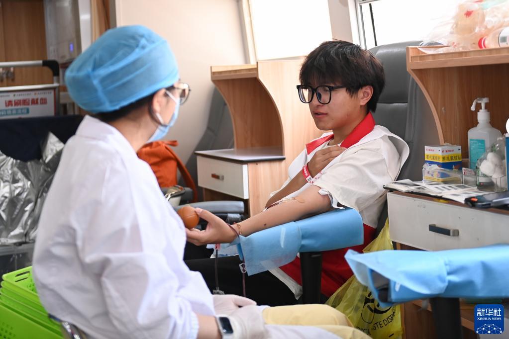 6月11日,青年志愿者在獻血車(chē)上無(wú)償獻血。
