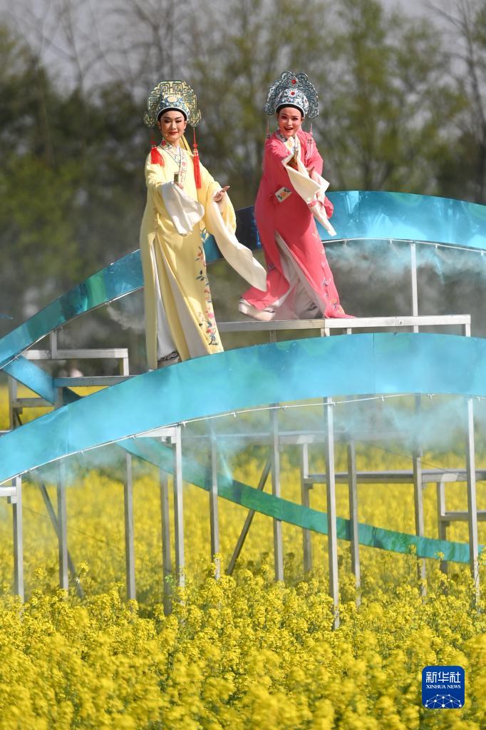 越劇演員在浙江桐廬梅蓉村油菜花田里的舞臺上表演(3月26日攝)。