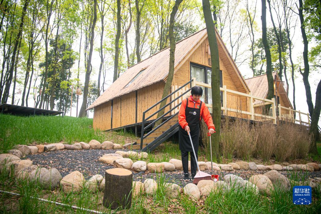 浙江諸暨楓橋鎮陽(yáng)春村村民在一家度假村內工作(3月29日攝)。當地通過(guò)閑置荒山土地流轉發(fā)展鄉村旅游,幫助陽(yáng)春村60名村民實(shí)現在家門(mén)口就業(yè)增收。