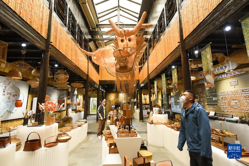 在浙江衢州龍游縣溪口村,游客在一家青年創(chuàng )客工作室的展廳觀(guān)賞竹制工藝品(4月3日攝)。