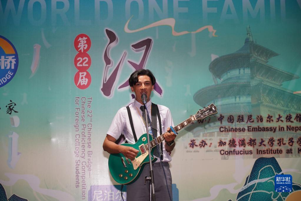 6月11日,在尼泊爾勒利德布爾,加德滿(mǎn)都大學(xué)孔子學(xué)院的楊魁(中文名)在“漢語(yǔ)橋”世界大學(xué)生中文比賽尼泊爾賽區決賽中表演才藝。楊魁在決賽中拔得頭籌,將代表尼泊爾賽區參加在中國舉辦的“漢語(yǔ)橋”總決賽。
