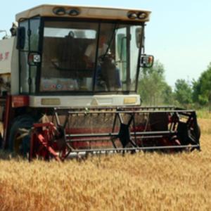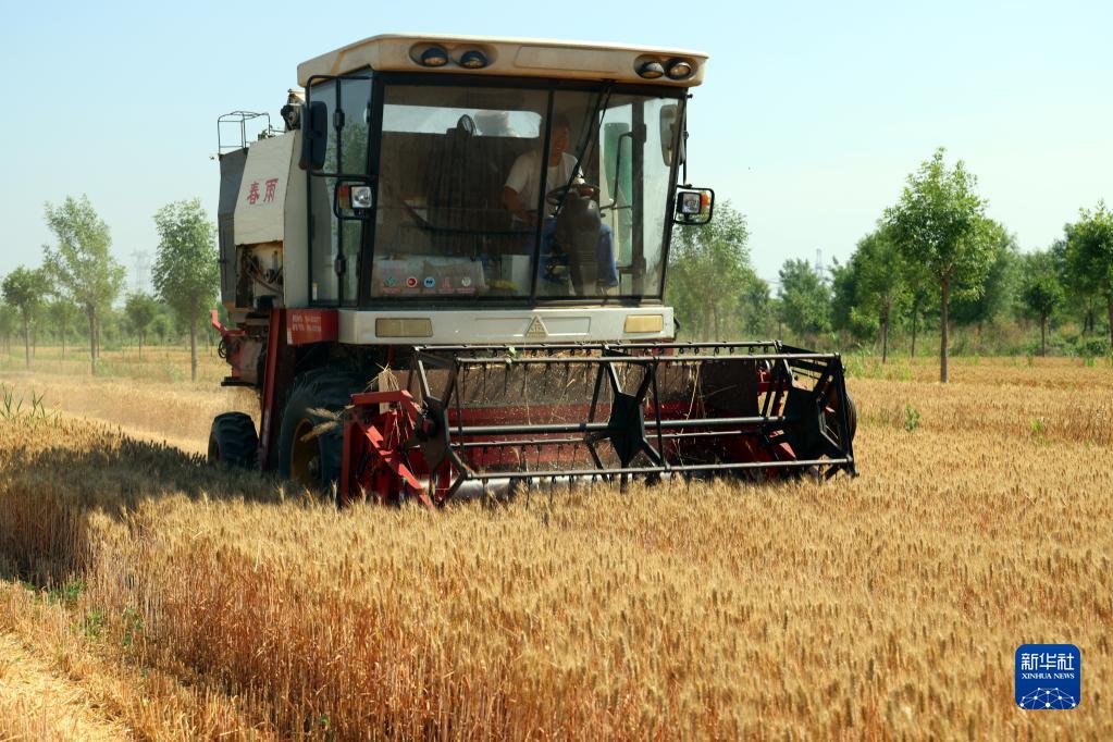 6月11日,在山東省濱州市沾化區泊頭鎮陳家村家庭農場(chǎng),小麥聯(lián)合收割機在田間進(jìn)行黑小麥收割作業(yè)。