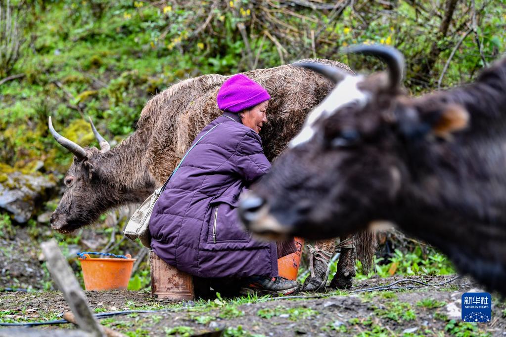 央宗在牧場(chǎng)擠奶(6月10日攝)。
