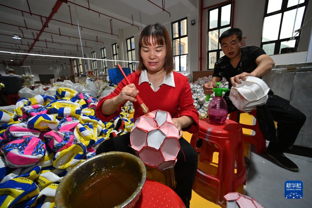 6月12日,工人在鳳岡縣一足球生產(chǎn)企業(yè)加工生產(chǎn)足球。