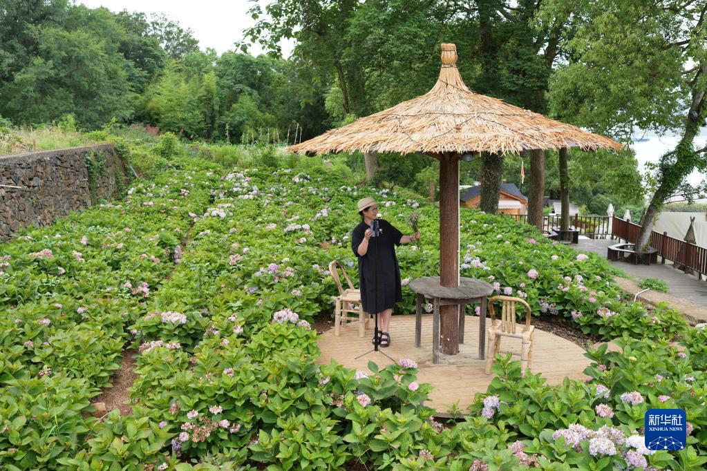 6月13日,一名女子在強蛟鎮一片繡球花間直播。