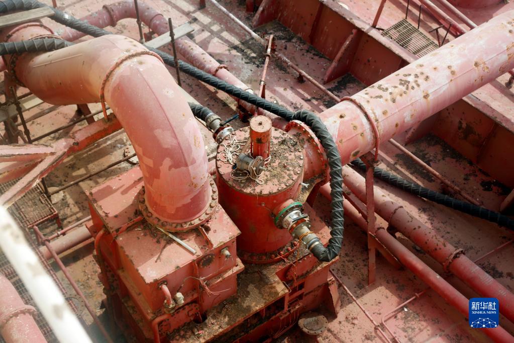 這是6月12日在也門(mén)荷臺達附近海域拍攝的“薩菲爾”號油輪上的輸油管。
