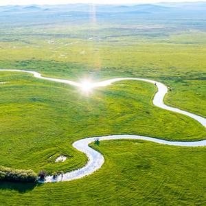 初夏時(shí)節,位于內蒙古自治區錫林郭勒盟東北部的烏拉蓋草原風(fēng)景宜人,蔚藍色的天幕下,綠色的草原廣闊無(wú)垠,蜿蜒流淌的烏拉蓋河綿延向遠方,美如畫(huà)卷。