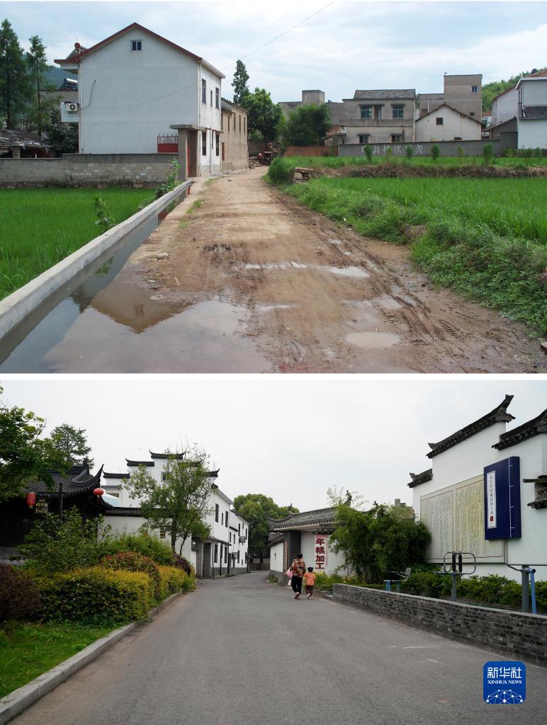 拼版照片:這是在同一地點(diǎn)拍攝的安吉縣鄣吳鎮鄣吳村景觀(guān)(上圖,王光法2000年攝;下圖,新華社記者韓傳號2023年6月13日攝)。
