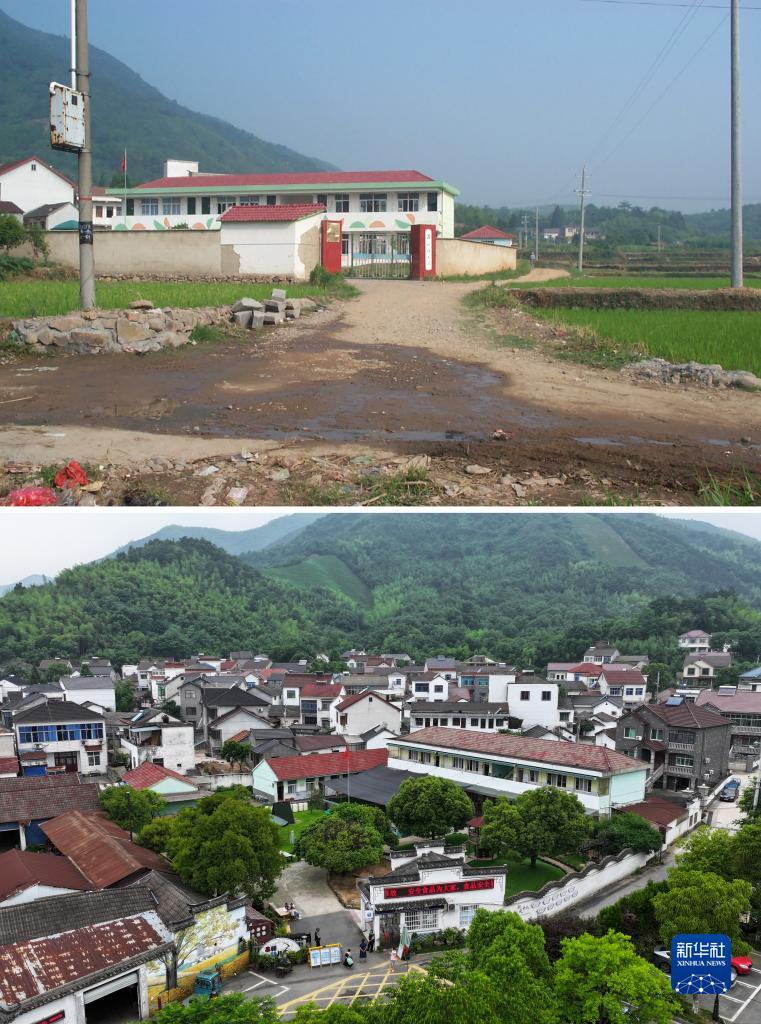 拼版照片:這是安吉縣鄣吳鎮鄣吳村幼兒園(上圖,王光法1999年攝;下圖,無(wú)人機照片,夏鵬飛2023年6月13日攝)。