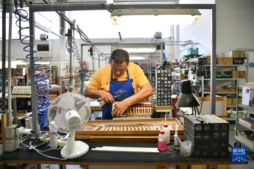 5月29日,在意大利卡斯特爾菲達多,貝爾杜納品牌手風(fēng)琴工匠組裝手風(fēng)琴。