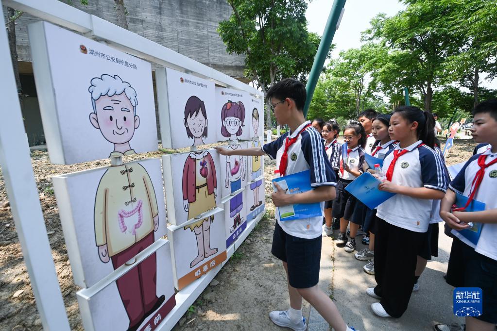 在第36個(gè)國際禁毒日來(lái)臨前,浙江省湖州市吳興區織里鎮織北派出所民警在織里鎮禁毒主題公園為湖州市織里實(shí)驗小學(xué)的師生開(kāi)展禁毒主題宣傳活動(dòng)。