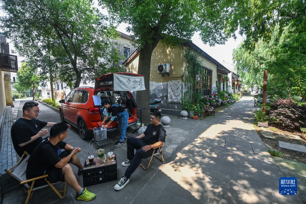 6月14日,游客在織里鎮廟兜村的民宿旁喝咖啡、休憩。