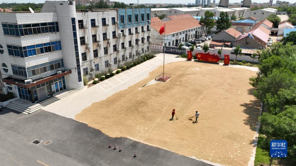6月13日,村民在陽(yáng)信縣金陽(yáng)街道辦事處辦公樓前晾曬小麥(無(wú)人機照片)。