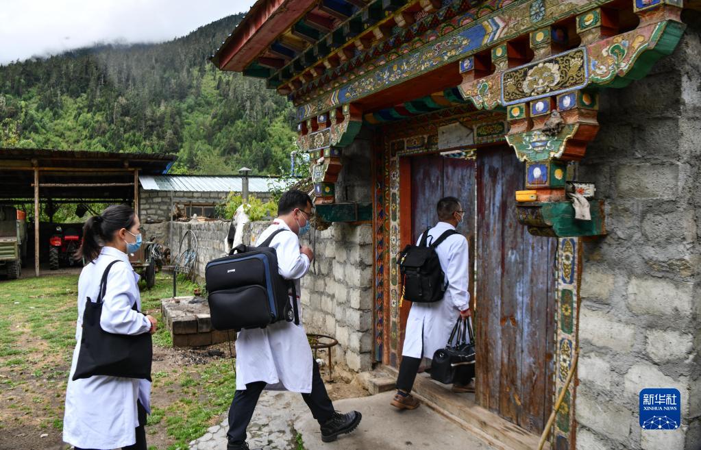 6月12日上午10點(diǎn),廣東珠海市人民醫院第七批援藏醫療隊隊長(cháng)王振疆、隊員陳冰、王彤旭和年輕的當地醫生尼瑪益西一起帶著(zhù)醫療設備和藥品,離開(kāi)西藏米林市人民醫院,驅車(chē)前往30多公里外的吞不絨村為患者進(jìn)行診療。