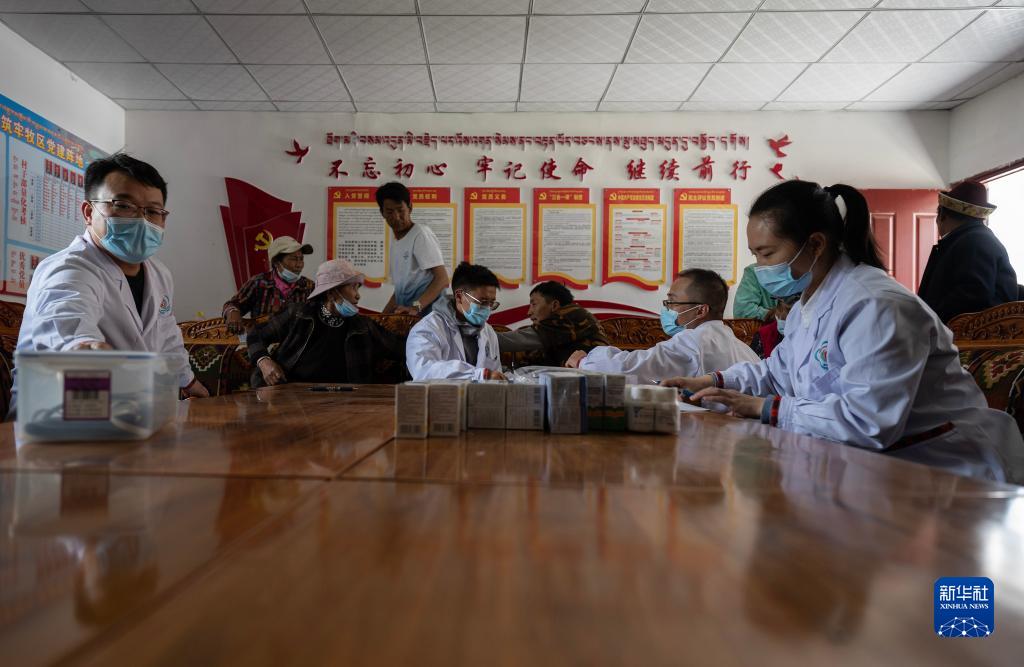6月12日,王振疆(前右二)、王彤旭(前左一)、陳冰(前右一)和尼瑪益西(前左三)在村委會(huì )會(huì )議室為患者診治。