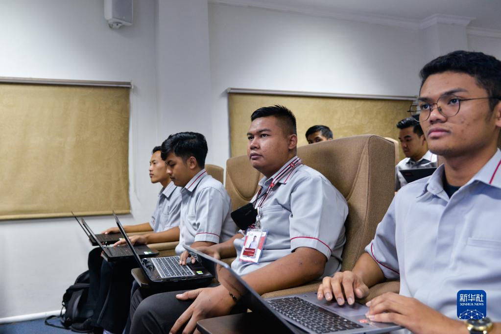 6月7日,在位于印度尼西亞茉莉芬市的印尼鐵路理工學(xué)院,動(dòng)車(chē)組機械師培訓班學(xué)員巴哈納(前右二)參加培訓。