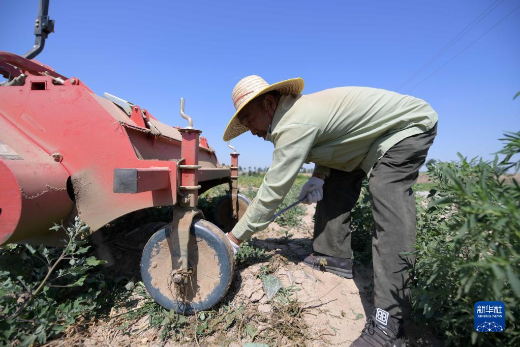 6月14日,在河北省滄州市吳橋縣安陵鎮,農民在調試農機設備。