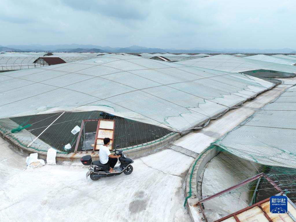 6月14日,在蛇蟠島上的一家水產(chǎn)養殖企業(yè),工作人員在養殖對蝦的小棚間巡察(無(wú)人機照片)。