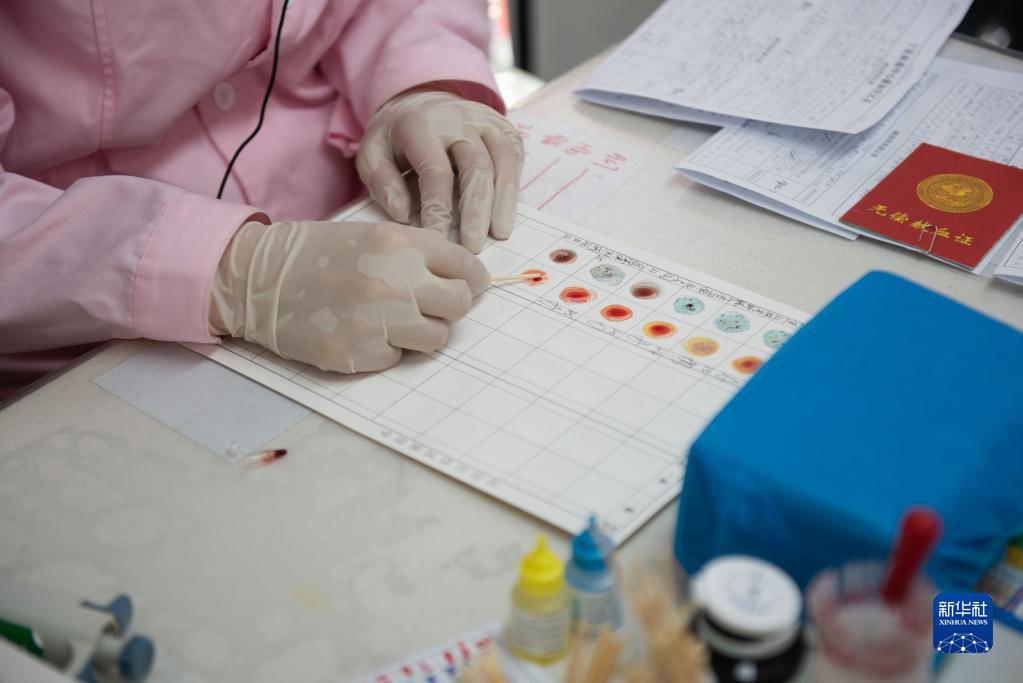 6月14日,在寧夏銀川市新華街愛(ài)心獻血車(chē)內,醫務(wù)人員為獻血者進(jìn)行血樣檢測。