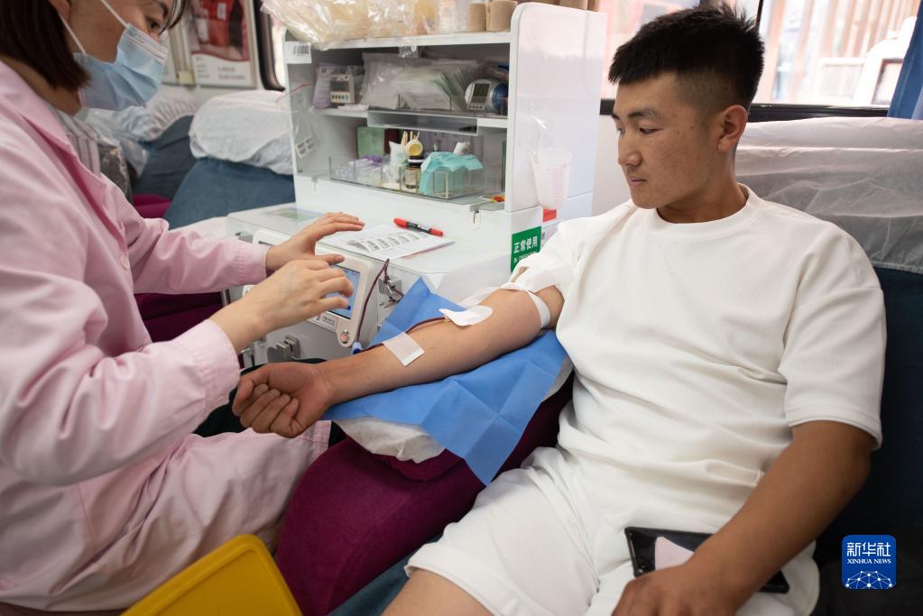 6月14日,市民在寧夏銀川市新華街愛(ài)心獻血車(chē)內獻血。