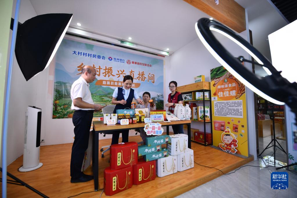 6月14日,在鹿寨縣鹿寨鎮大村村,村干部和村民在準備直播帶貨。