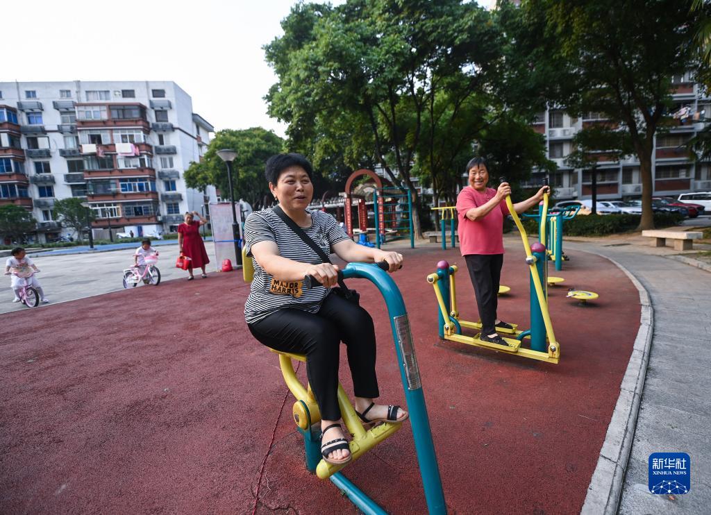 6月14日,在嘉興市南湖區新嘉街道電子社區內,老人們在進(jìn)行器械鍛煉。