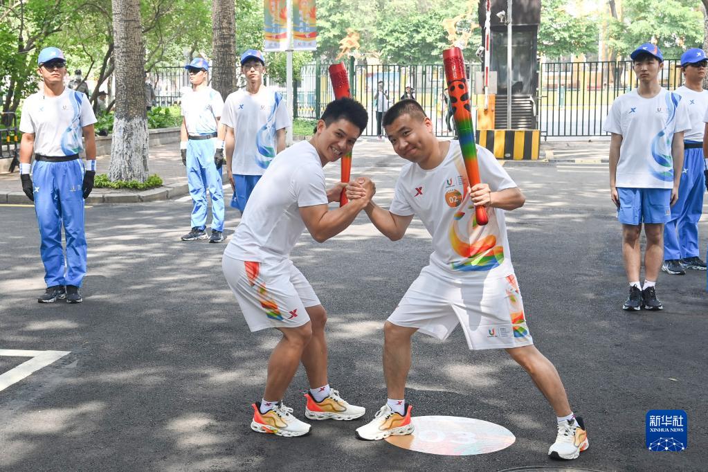 6月15日,火炬手鐘齊鑫(前左)與郭子平在火炬傳遞中交接。