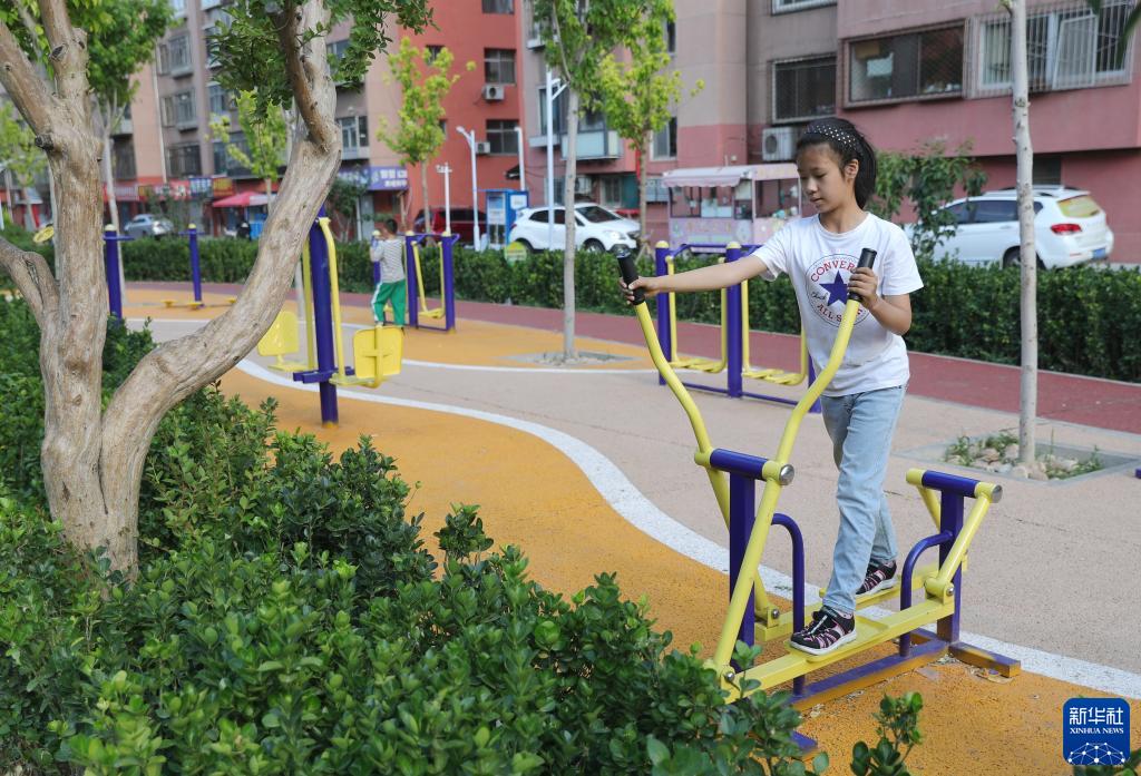 6月3日,小朋友在秦皇島市海港區一改造完工的小區廣場(chǎng)玩耍。這個(gè)小區廣場(chǎng)地面為可透水地面。