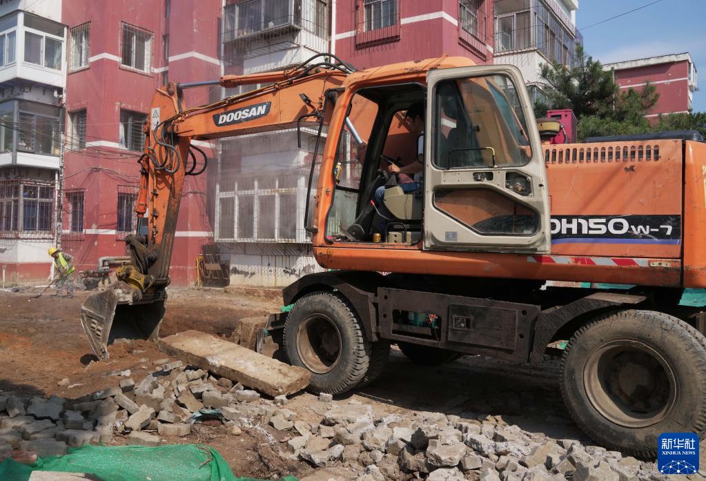 6月14日,工人在秦皇島市海港區一老舊小區改造工地施工。