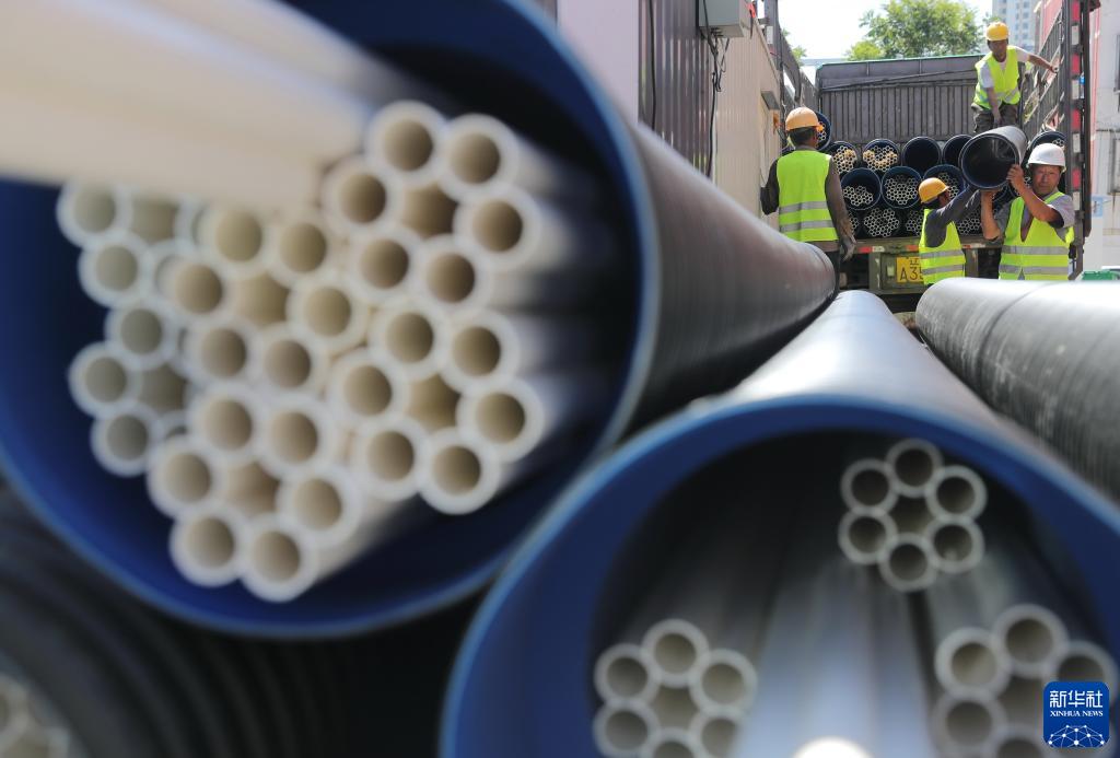6月4日,工人在秦皇島市海港區一老舊小區改造工地搬運管網(wǎng)水管。