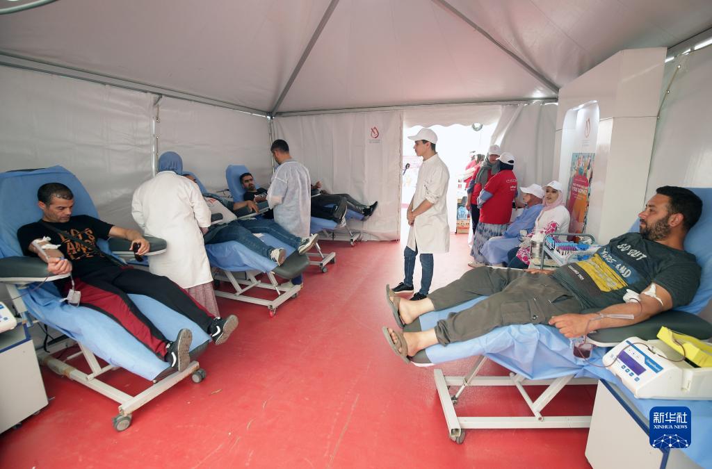 6月14日,志愿者在阿爾及利亞阿爾及爾一處獻血點(diǎn)獻血。