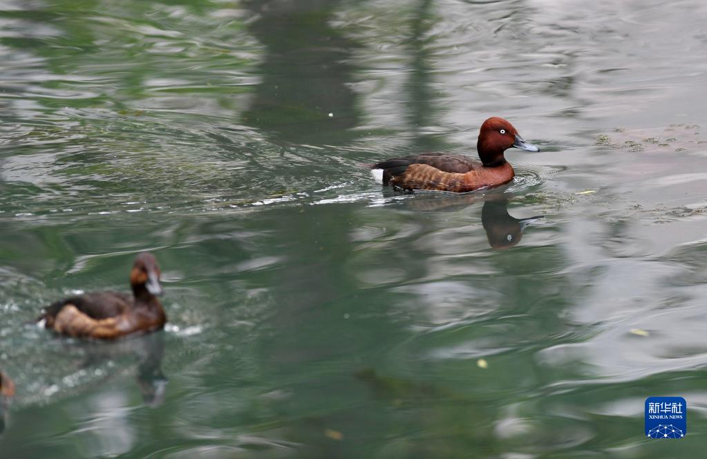 夏日里,白眼潛鴨和鳳頭潛鴨在西藏拉薩市拉魯濕地國家級自然保護區中干渠里覓食、嬉戲。
