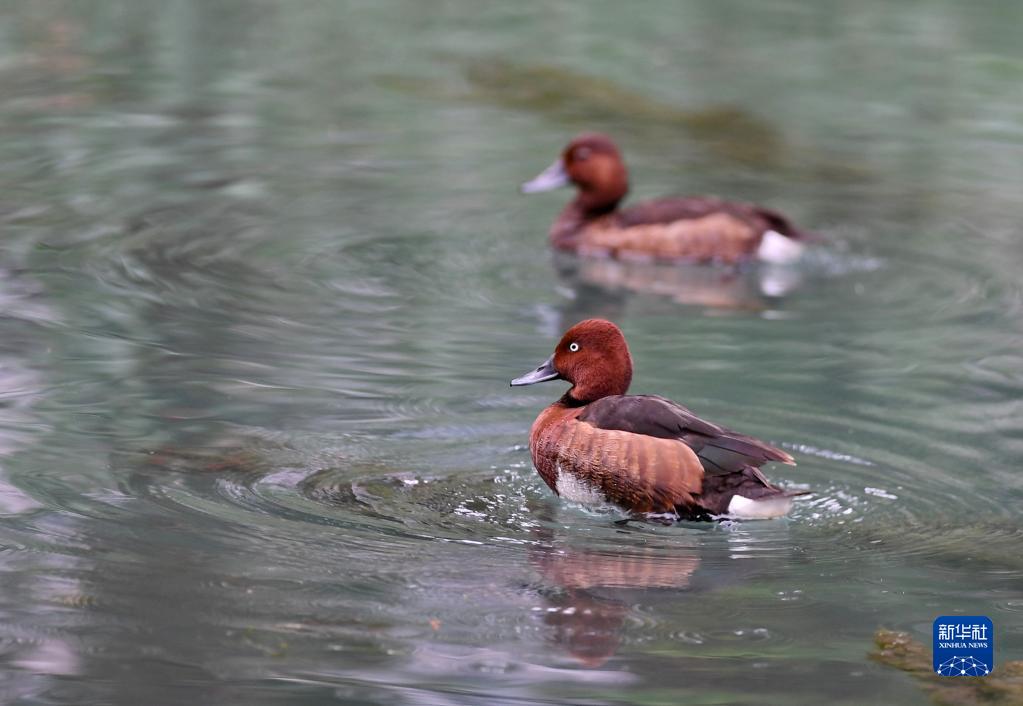 夏日里,白眼潛鴨和鳳頭潛鴨在西藏拉薩市拉魯濕地國家級自然保護區中干渠里覓食、嬉戲。