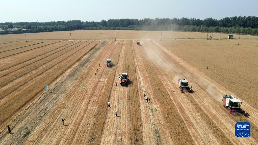 6月15日拍攝的2023年北京市小麥機收減損技能大比武現場(chǎng)(無(wú)人機照片)。