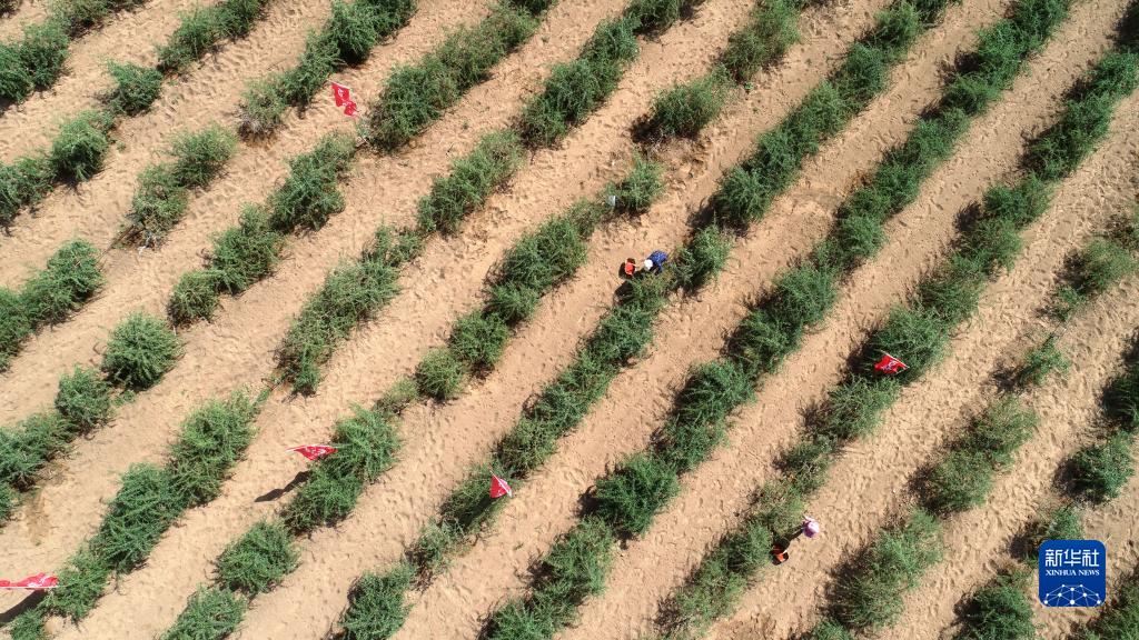 6月15日,采摘工在寧夏吳忠市紅寺堡區百瑞源枸杞種植基地采摘枸杞(無(wú)人機照片)。
