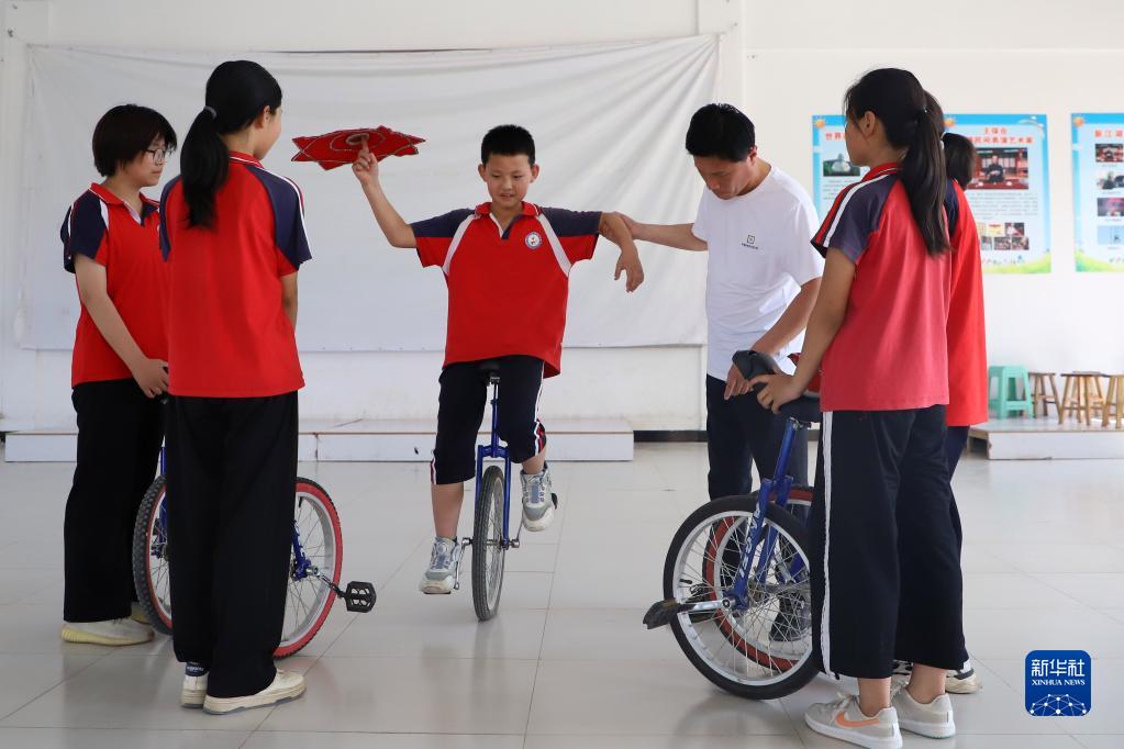6月15日,在河北省滄州市吳橋縣馬庫吏小學(xué),老師指導學(xué)生練習雜技獨輪車(chē)。