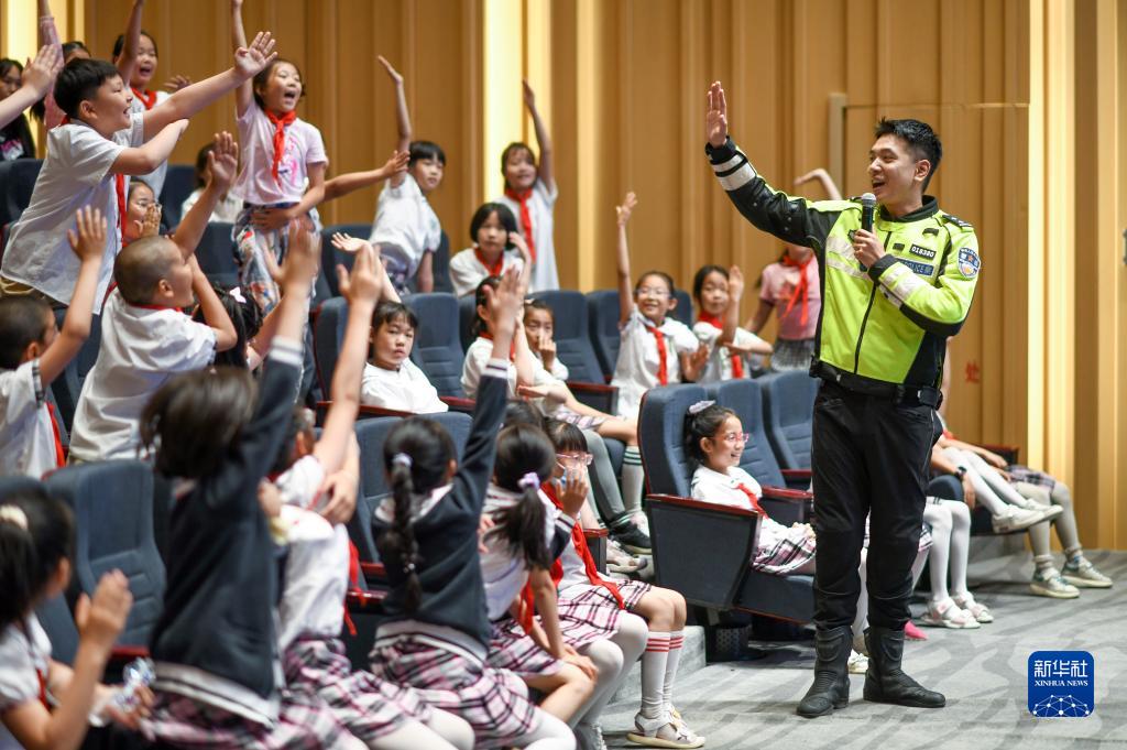 6月15日,在新疆文化館劇場(chǎng),烏魯木齊市第十四小學(xué)的學(xué)生在烏魯木齊市公安局交通警察支隊民警的帶領(lǐng)下互動(dòng)搶答,學(xué)習交通安全出行知識。