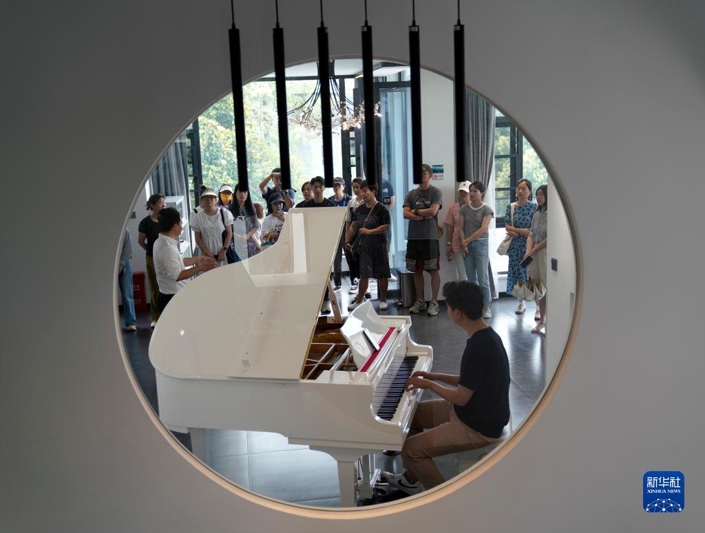 6月15日,在浙江省德清縣莫干山鎮燎原村,民宿主和民宿管家在一家音樂(lè )主題民宿參觀(guān)取經(jīng)。