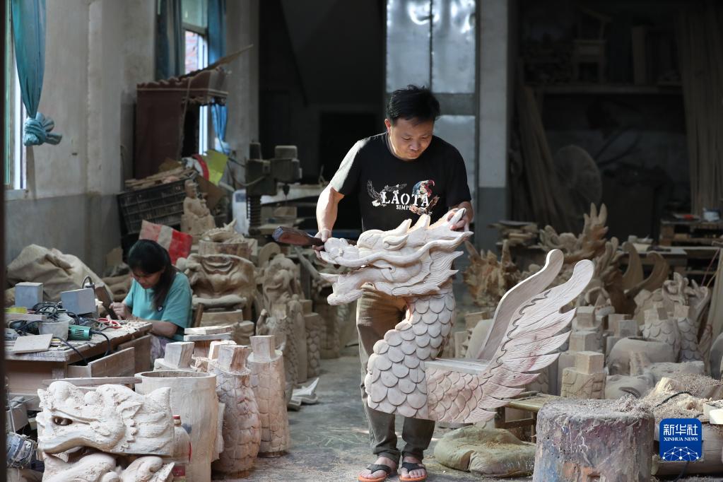 福州市閩侯縣方莊村一位匠人搬運剛雕刻完成的龍舟龍頭(6月12日攝)。