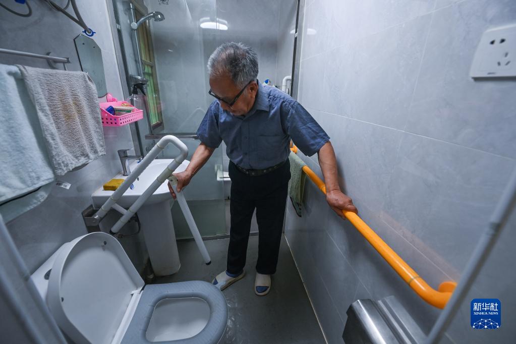 6月15日,住在嘉興市秀洲區新塍鎮蓬萊社區的83歲獨居老人孫志龍展示經(jīng)過(guò)適老化改造后加了扶手的衛生間。秀洲區民政局和蓬萊社區工作人員將其列為“家庭養老床位”服務(wù)對象,在老人的床上安裝了智能傳感器。老人睡眠時(shí)的呼吸、心率、打鼾頻率等身體數據能實(shí)時(shí)記錄到大數據后臺,并連接到其子女的手機上,一旦數據出現異常,不僅其子女能第一時(shí)間獲悉,受委托的醫護人員也能及時(shí)趕過(guò)去查看情況。另外,走廊、臥室等也進(jìn)行了適老化改造,方便老人的日常居家生活。
