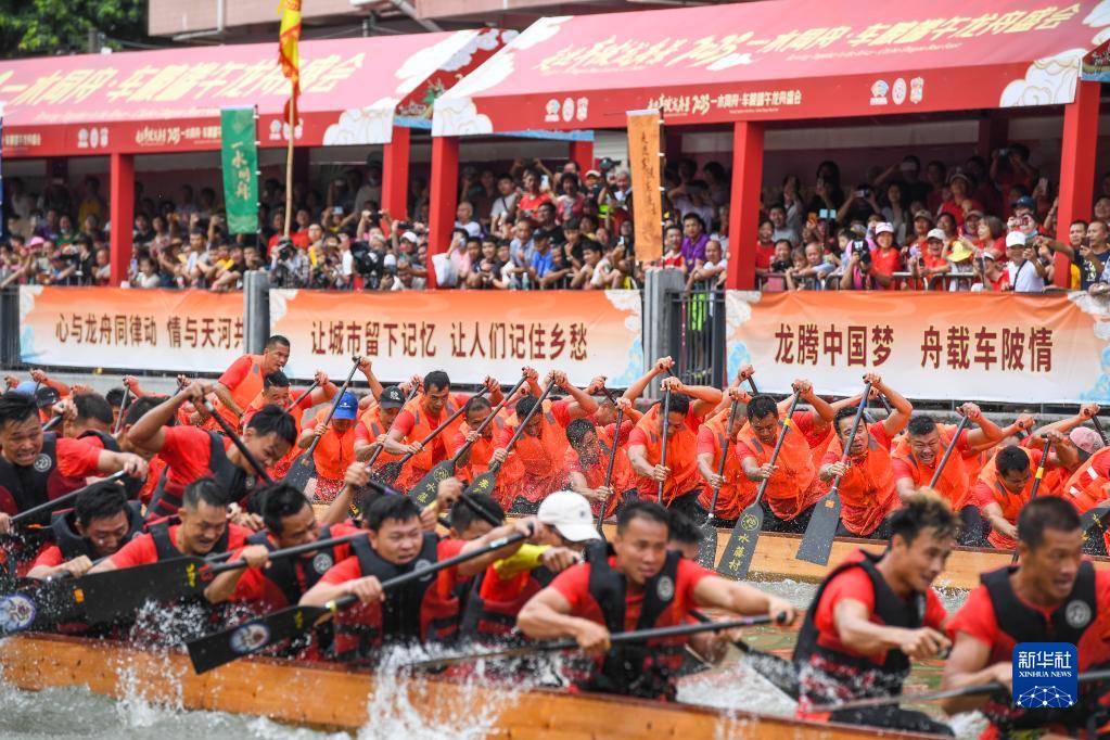 自農歷四月初八“起龍舟”開(kāi)始,廣州地區就開(kāi)啟了劃龍舟、迎端午的年度大戲。6月15日,車(chē)陂村12條龍船在車(chē)陂涌進(jìn)行龍舟競渡。