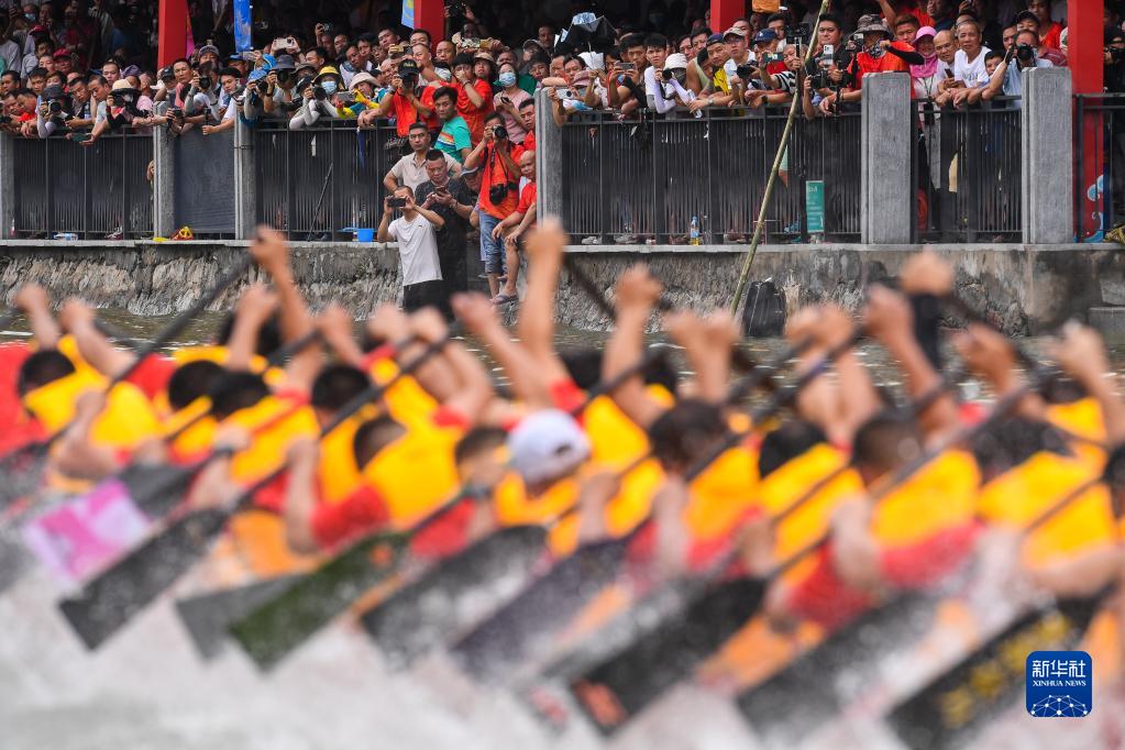 自農歷四月初八“起龍舟”開(kāi)始,廣州地區就開(kāi)啟了劃龍舟、迎端午的年度大戲。6月15日,車(chē)陂村12條龍船在車(chē)陂涌進(jìn)行龍舟競渡。