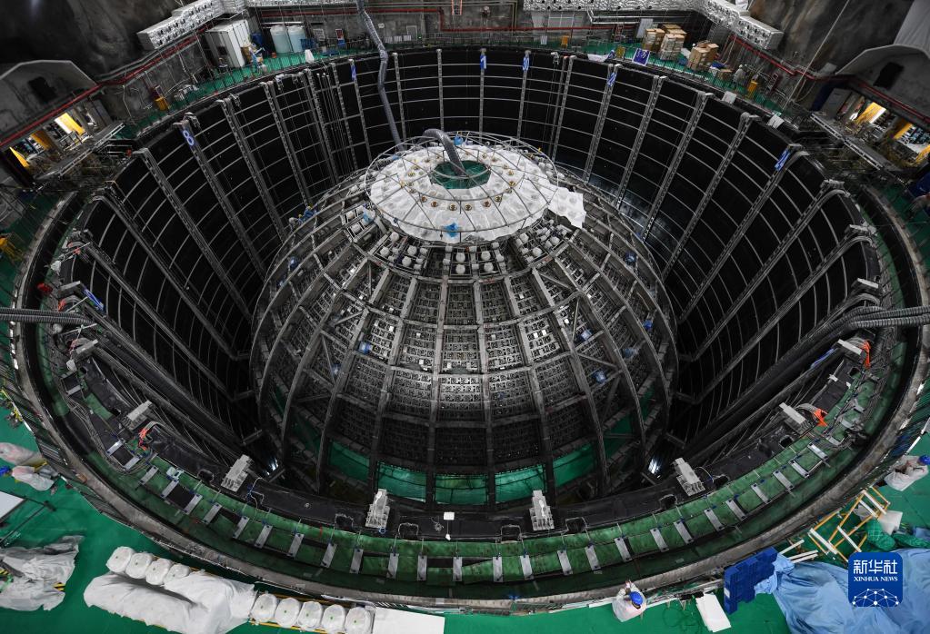 位于地下700米的江門(mén)中微子實(shí)驗探測器呈現巨大的球形結構(6月15日攝)。
