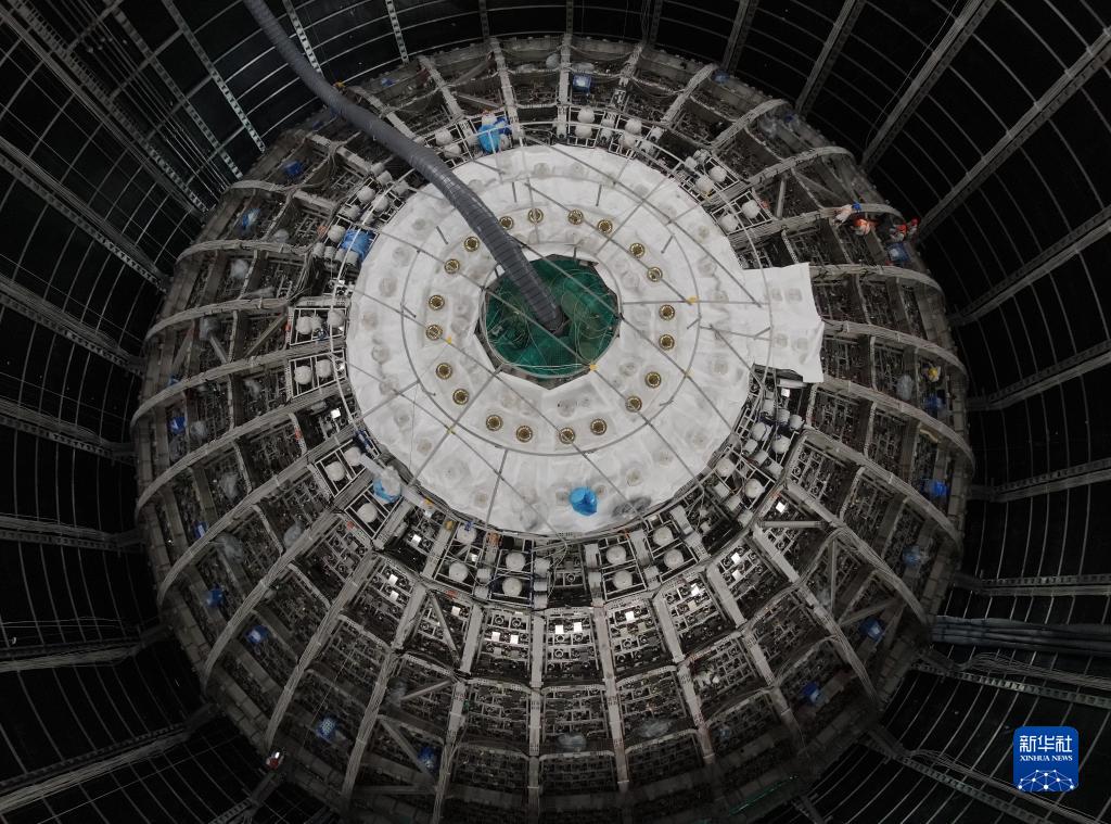 位于地下700米的江門(mén)中微子實(shí)驗探測器呈現巨大的球形結構(6月14日攝,無(wú)人機照片)。