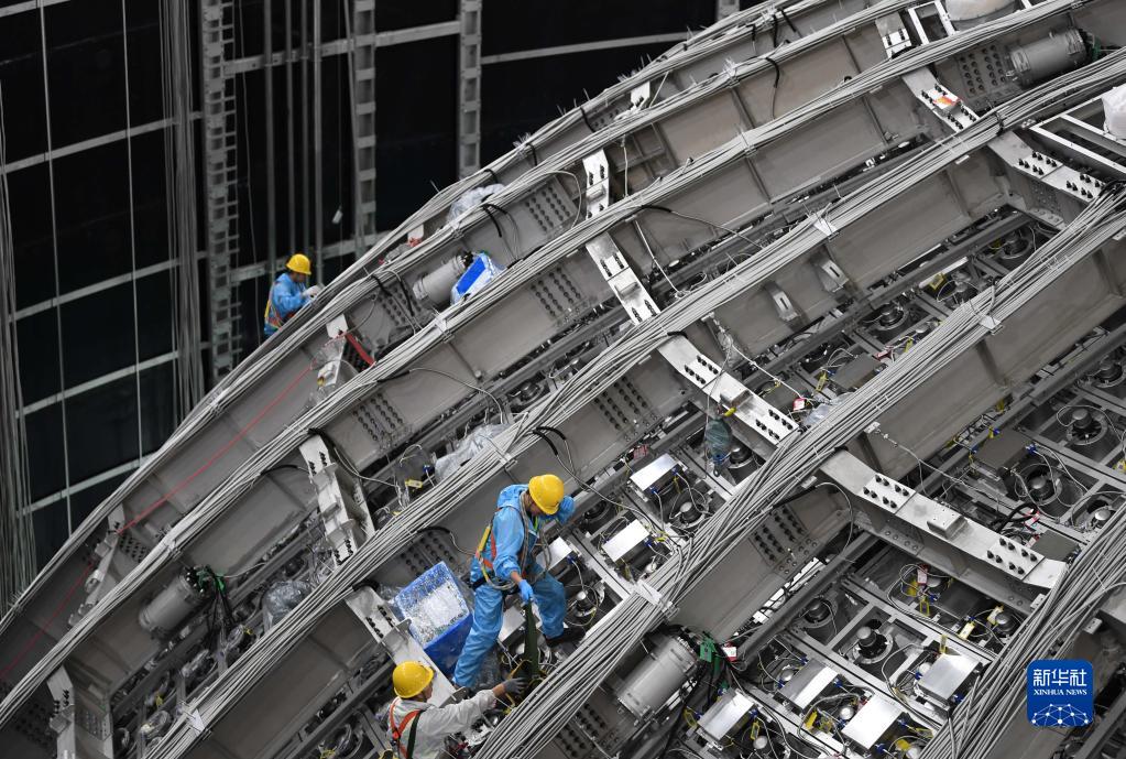 6月15日,工作人員在江門(mén)中微子實(shí)驗探測器的不銹鋼結構上進(jìn)行安裝作業(yè)。